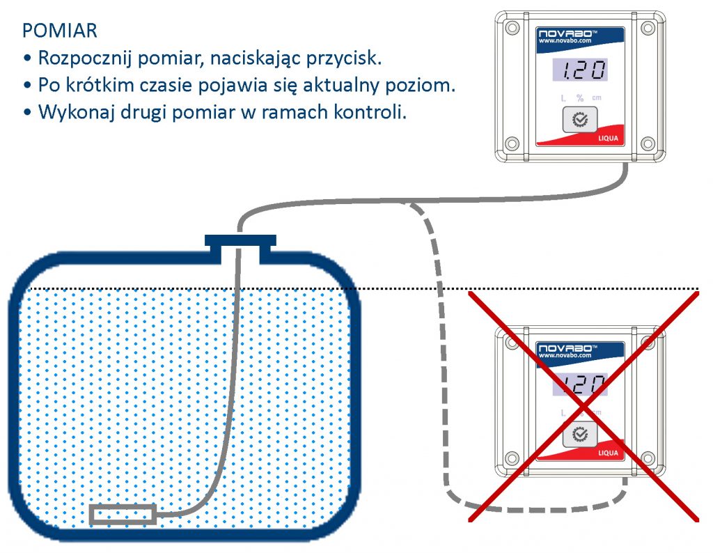 Urządzenie wskazuje domyślnie wynik w [cm]. Istnieje możliwość zmiany sposobu wyświetlania w litrach [l.], procentach [%], centymetrach [cm]. Pomiar realizowany jest przez krótkie naciśnięcie przycisku. Urządzenie zasilane jest z baterii o napięciu 9V. W przypadku słabej baterii urządzenie informuje o konieczności jej wymiany komunikatem „bat”.