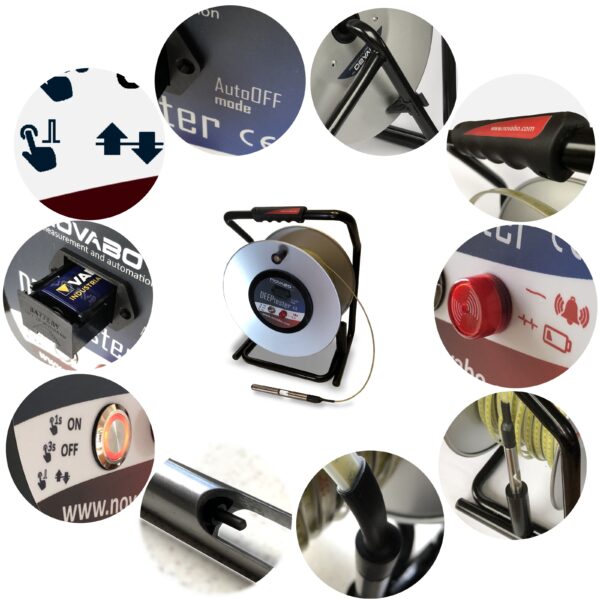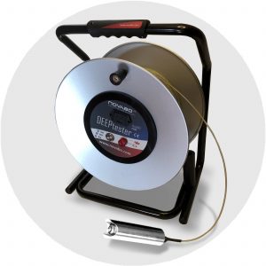 Przenośny tester głębokości lustra cieczy “deepMAX” (rozpoznaje wodę, oleje, substancje ropopochodne) – przenośne urządzenie zasilane bateryjnie, przeznaczone do pomiaru głębokości poziomu lustra wody. Stosowane w celu monitorowania zmian poziomu cieczy, przy odwiertach, konserwacjach zbiorników itp. Informacja z sondy (fi 16mm) przekazywana jest do pulpitu sterowniczego umieszczonego w bębnie i w sytuacji zetknięcia z cieczą generuje sygnał optyczno-akustyczny. Posiada możliwość zmiany polaryzacji zadziałania (zanurzenie generuje alarm, albo wynurzenie generuje alarm).