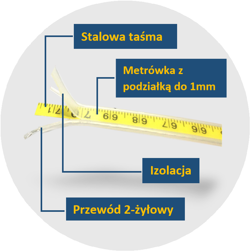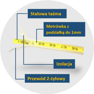 Taśma pomiarowa z zatopionym metalowym prowadzeniem, które zabezpiecza przed rozciąganiem przewodu. Przewód dwu-żyłowy (2 linki z przeplotem miedzi i stali) izolowany na całej długości materiałem odpornym na ścieranie. Na zatopionej taśmie stalowej, pod powłoką izolacji, nadrukowana jest podziałka z dokładnością do 1 mm. Dostępne długości przewodów to 15 m, 30 m, 50 m, 100 m, 150 m, 200 m, 300 m, 500 m lub większe.