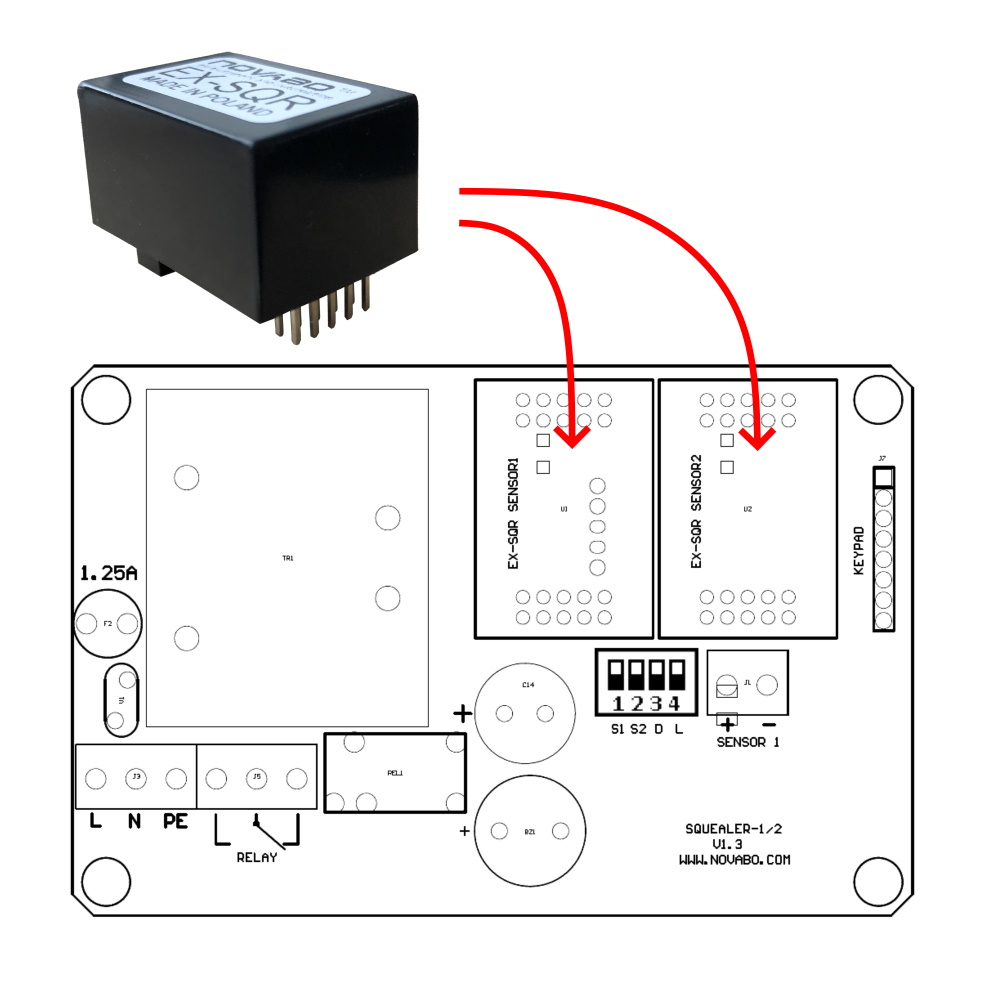 The intrinsically safe limiter is installed inside the SQUEALER / SQR controller, in the place marked with the EX-SQR symbol. Before that, the factory-installed jumper on the pins of the socket should be removed