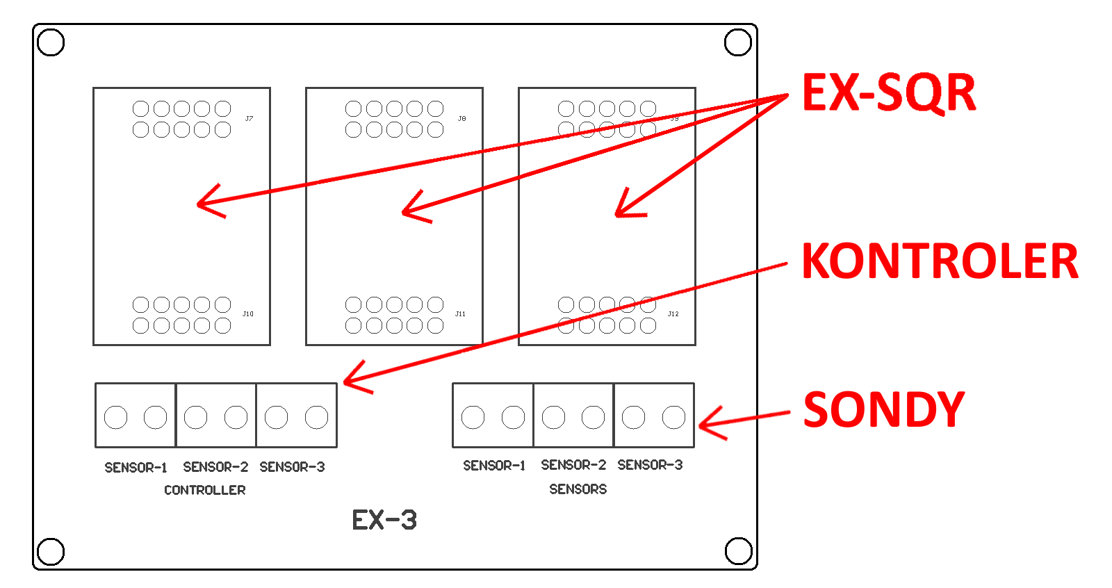 The EX-SQR-3 unit includes three EX-SQR modules placed in an IP65 hermetically sealed housing. The device has three channels allowing connection of three independent probes like MAX, OILER or SLUDO.