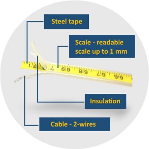 Measuring tape with embedded metal guide, which protects against stretching of the wire. Two-core wire (2 copper and steel interlaced strands) insulated along its entire length with abrasion-resistant material. On the embedded steel tape, under the insulation coating, a scale is printed with an accuracy of 1 mm. Available wire lengths are 15 m, 30 m, 50 m, 100 m, 150 m, 200 m, 300 m, 500 m or more.