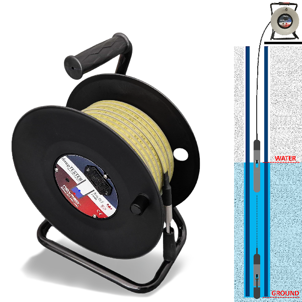 Measuring tape with embedded metal guide, which protects against stretching of the wire. Two-core wire (2 copper and steel interlaced strands) insulated along its entire length with abrasion-resistant material. On the embedded steel tape, under the insulation coating, a scale is printed with an accuracy of 1 mm. Available wire lengths are 15 m, 30 m, 50 m, 100 m, 150 m, 200 m, 300 m, 500 m or more.
